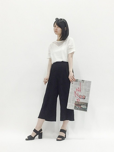 色の面積が広く、重くなりがちな黒のガウチョパンツも首元が透けていることでバランスの良いコーデに!