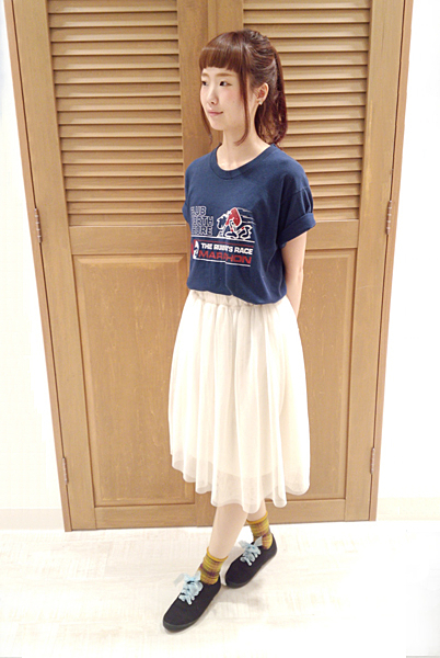 無地のシンプルなTシャツですが、ふわと広がるAラインがとっても女の子っぽいです。