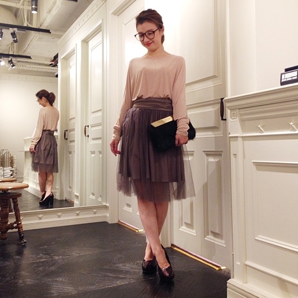 女の子らしいカラーのロングチュールスカートにグレーのトップスがキュートですね。アクセやバックでアクセントをつけて甘すぎないようなコーデをしたいアイテムです。