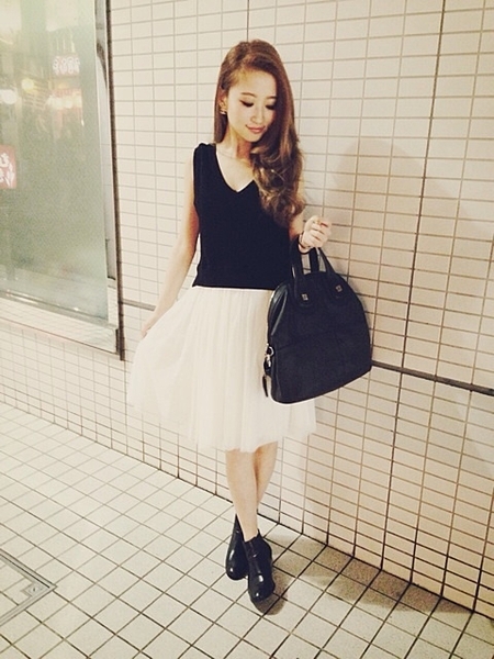 甘い雰囲気のチュールスカートにはシックなカラーやモノトーンのトップスがおすすめです。高すぎないヒールを合わせて清楚に着こなしたいアイテムです。