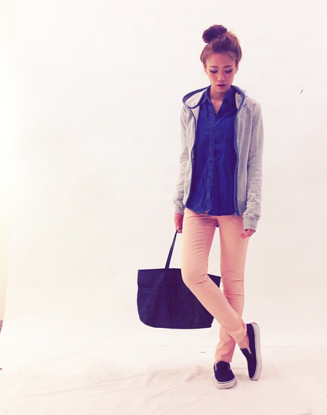 スリムでロゴが特徴のパーカーにチェック柄シャツの袖を出して可愛く着こなしているのがキュートですね。同系色で揃えているところがオシャレです。