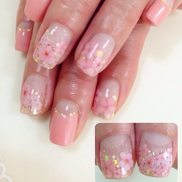ナチュラルなフレンチネイルとお花柄のネイルがcute♡