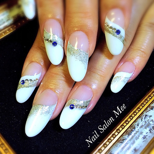 ★サマーネイル★ 斜めフレンチに、 斜めのボーダーを。 ゴールドのラメラインとストーンを合わせて♪ 大人なマリンネイルに #かわいかったらRT http://t.co/paTBh9JZ7N