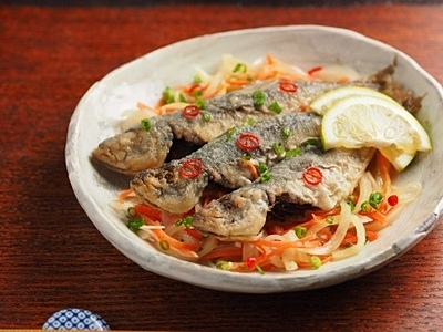 楽天レシピ:「小鯵南蛮漬け 骨ごと食べるならこの方法 」より