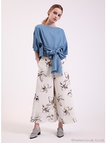 ウエストで結んだ大胆なリボンが目を惹くトップス。