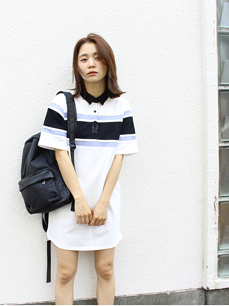 ライン入りと鹿の子素材でカジュアルですが、衿が布帛なのでカジュアルになりすぎないようこだわっています。スニーカーやサンダルとのメンズライクなアイテムと合わせるとストリートになります。