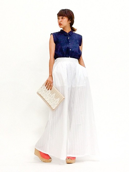 清楚感のあるサックスブルーのノースリーブシャツと白スカートで上品に♡