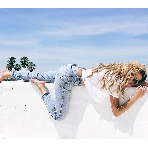 短めの白Tで肌をチラ見せするのもポイント。