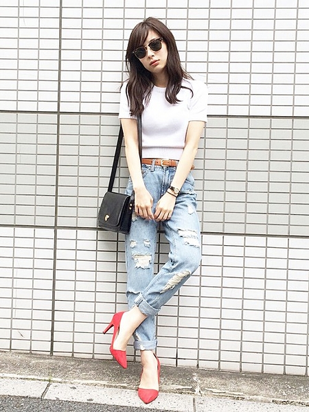 赤の差し色でダメージデニムも