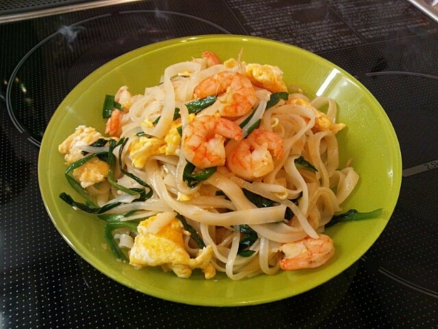 ビーフンを熱湯に浸して8分戻し(戻し過ぎに注意!)、その間にいりたまごを作って皿に取り出しておきます。同じフライパンでエビ、にら、もやしをを炒め、そこへビーフンといりたまごを合わせてパッタイソースと混ぜるだけ。仕上げにナンプラーを混ぜて出来上がり。