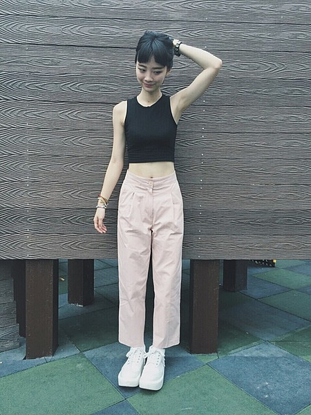 ボーイッシュな印象になりがちなタックルパンツはトップスをピンクにすることでがらっと雰囲気を変えられます♡