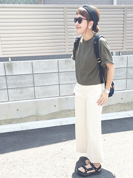 カーキのTシャツの着こなしもおしゃれ度UP♡