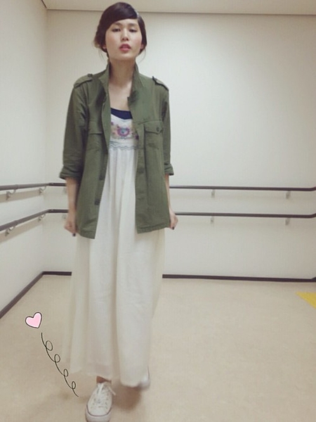 白の柔らかワンピに差し色としてカーキを足しましょう。