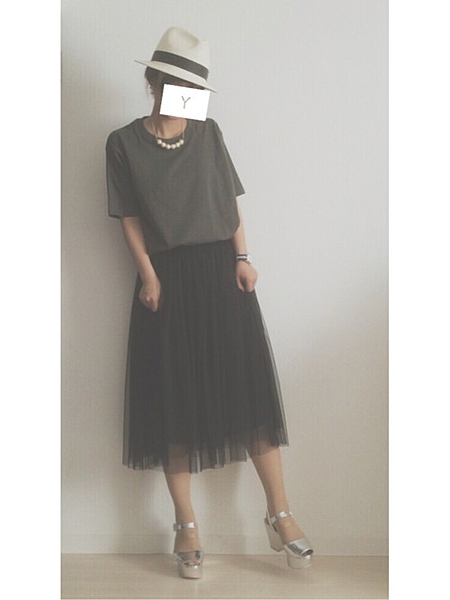 チュールスカートなど柔らかな印象になるものでブラックを取り入れて。