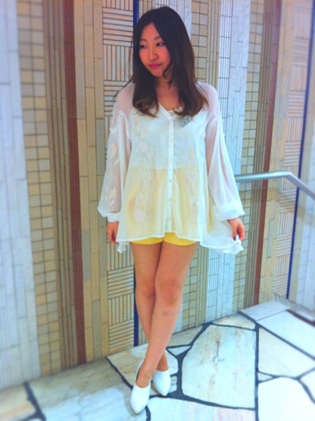 中にビタミンカラーのショートパンツを履いて、元気だけどおフェロに着こなしていますね。透ける素材は男子のハートをずっきゅんしますよ♡