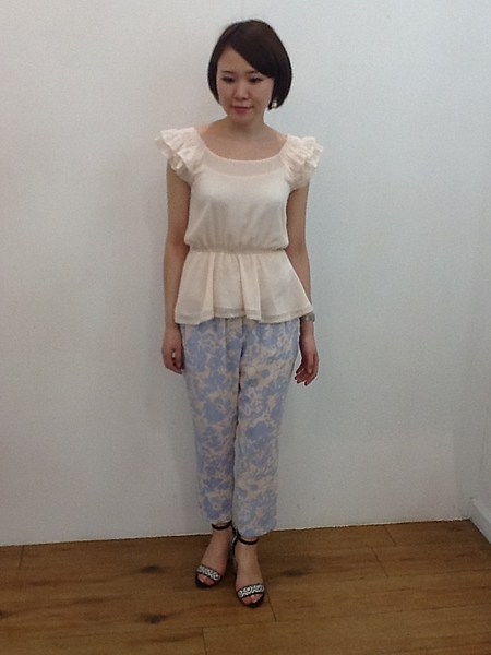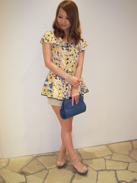 花柄のぺプラムチュニックは今年流行の黄色い花をチョイス!黄色が入ると一気に華やかになりますね。