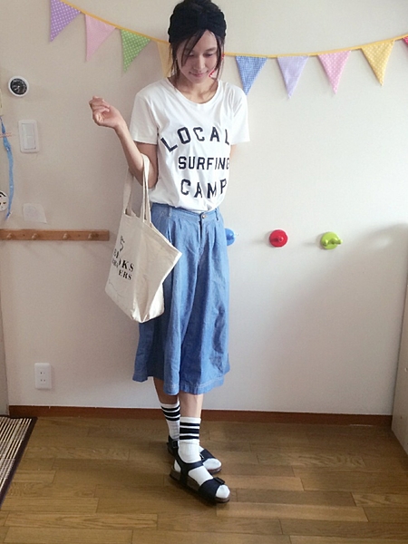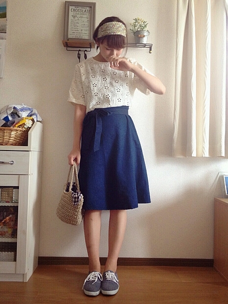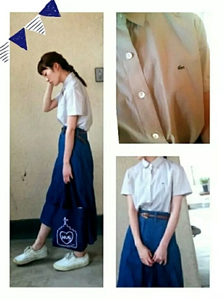 マリンっぽい組み合わせのシャツ×デニムスカート。