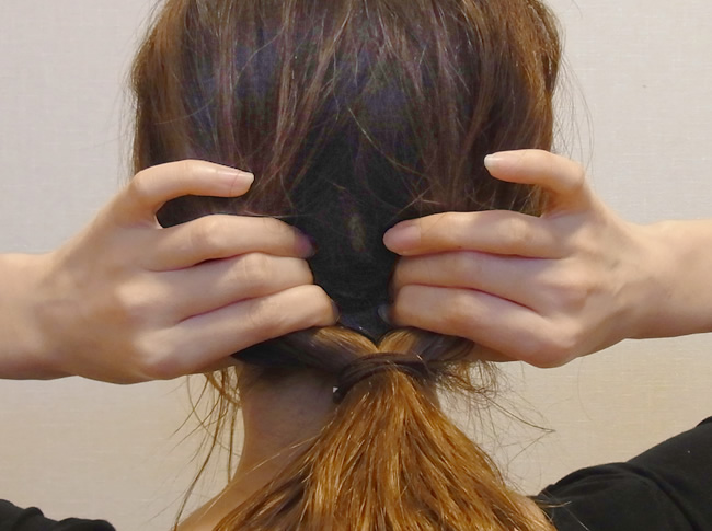 出典:http://yuigami.com 結び目は少し余裕をもたせて頭から少しはなした位置で結びます。そして真ん中から二つに分け穴をつくります。