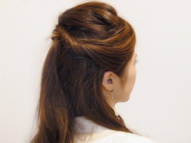 出典:http://yuigami.com サイドの髪は後ろまで添わせてポンパドールで留めたすぐ下の位置まで持ってきましょう。そこでピンを使って留めます。