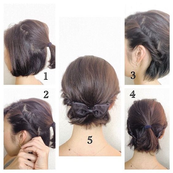 出典:https://jp.pinterest.com/ こちらも手順付きでわかりやすいですね。リボンで上手くゴムが隠れていて、アップ風のアレンジに見えますね。トップを結んで、サイドはねじって留めているだけなので慣れれば5分くらいで出来るアレンジです。