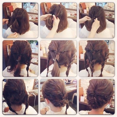 出典:https://jp.pinterest.com/ 手順付きで分かりやすいですね。くるりんぱとツイストを組み合わせてアップ風に仕上げたアレンジです。トップにある程度の長さがあれば、あとは分けてねじって留めるだけ。もう少し短い人は、バックも2本に分けると留めやすいと思います。