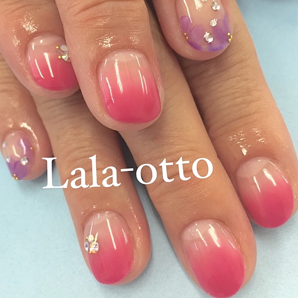 ピンクのグラデーションネイルにお花のデザインを加えることで女の子らしさを引き出しています!