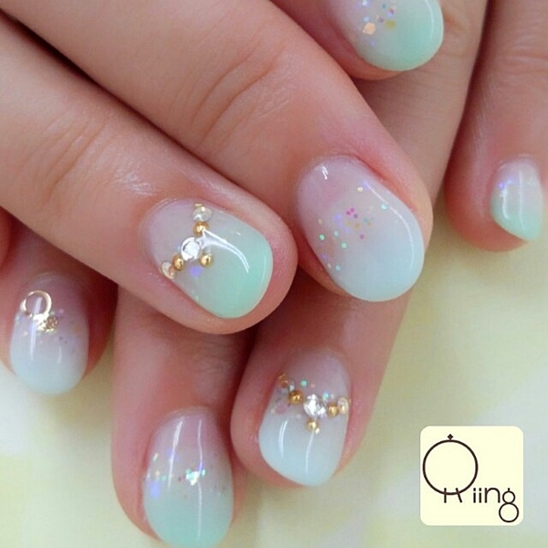 つめ先がほんのり水色に色づいていてシンプルな可愛さがポイント。