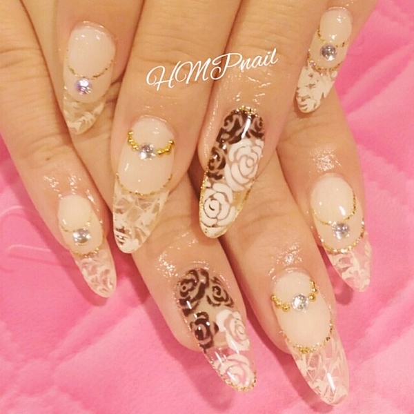 キラキラにデコった爪と、バラで大人可愛く仕上げた爪が凄く合ってるスカルプネイル♡