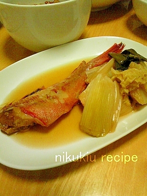 楽天レシピ:「簡単おいしい!金目鯛とねぎと白菜の煮付け 」より