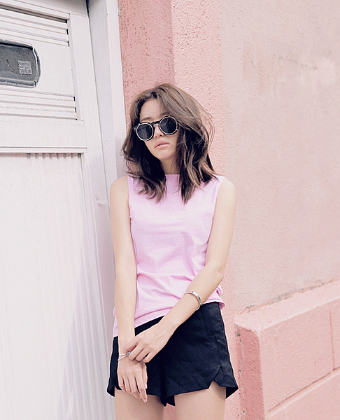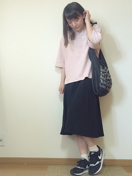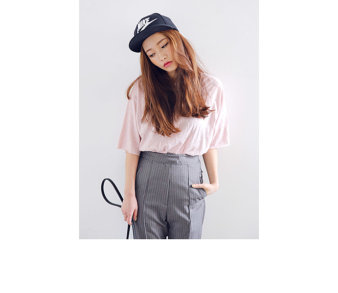 ベビーピンクのTシャツ1枚あればジャンルを問わないコーディネートが完成!