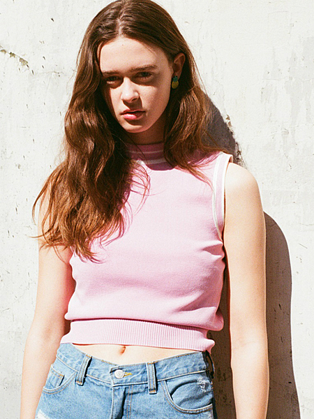 ベビーピンク×ハイネックノースリーブはとっても上品に仕上がります。