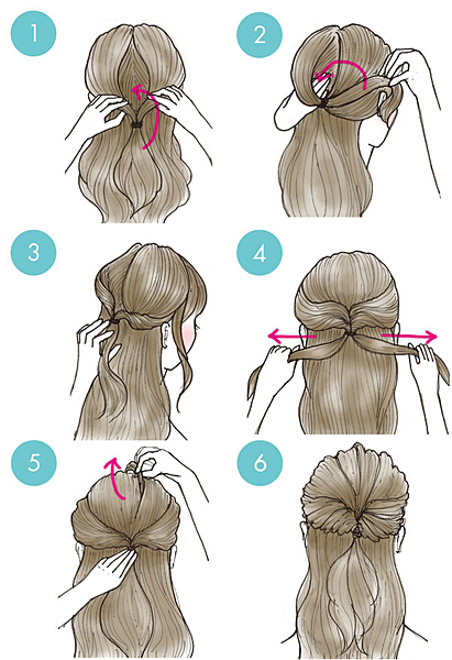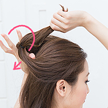 2毛束を矢印の方向に持っていき、二つに分けた隙間に入れます。(くるりんぱ!)