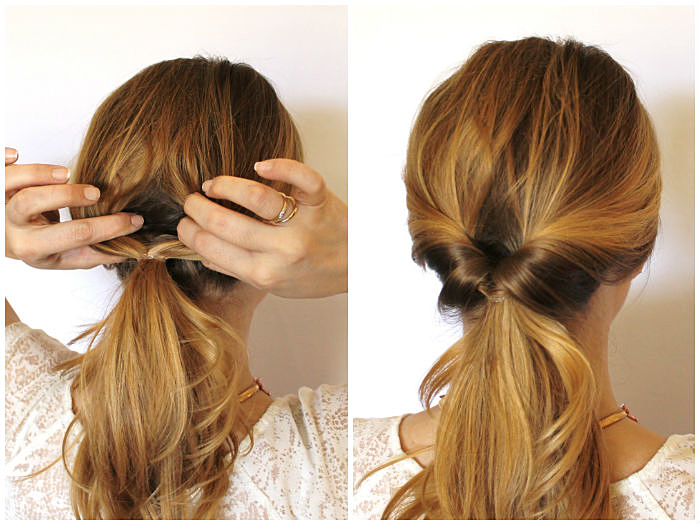 5結び目を持って、トップの毛束を引き出すようにゆるませます。