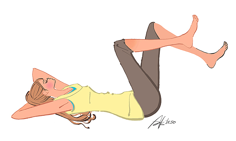 ①仰向けに寝て、手は両脇に広げ、肩甲骨をしっかりと床につけます。両足をそろえて(クロスでも可)して上へあげます。