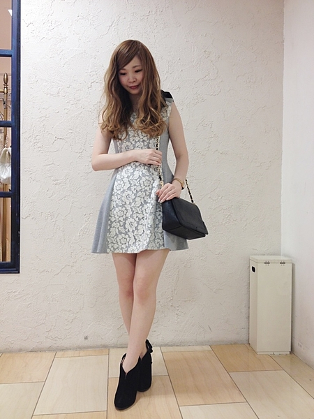 アイスグレーのワンピースに前の部分が花柄のレースになっています。アイスグレーもCanCam女子のモテカラーの一つと言われています。