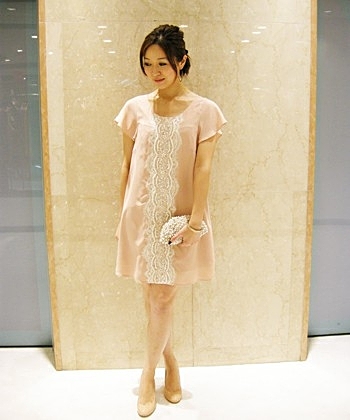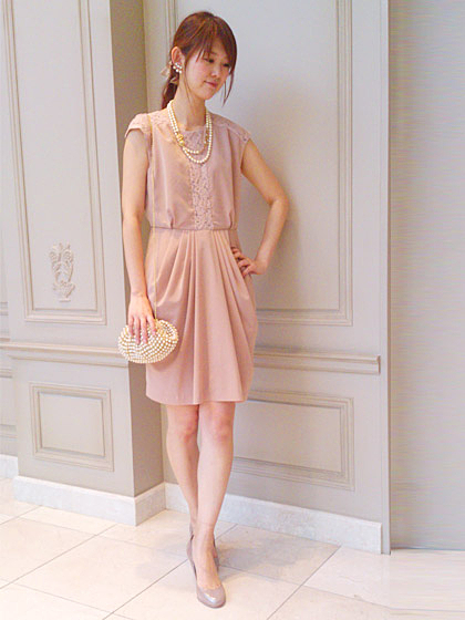 縦長効果のあるように白のレースが入ったパステルピンクのワンピースです。レースの感じに合わせて、パールのクラッチバッグを持つと良いでしょう。