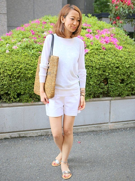 ストローハットやかごバッグ、サンダルなど夏らしいアイテムのものを取り入れると抜け感UPで今年らしい仕上がりになります♪