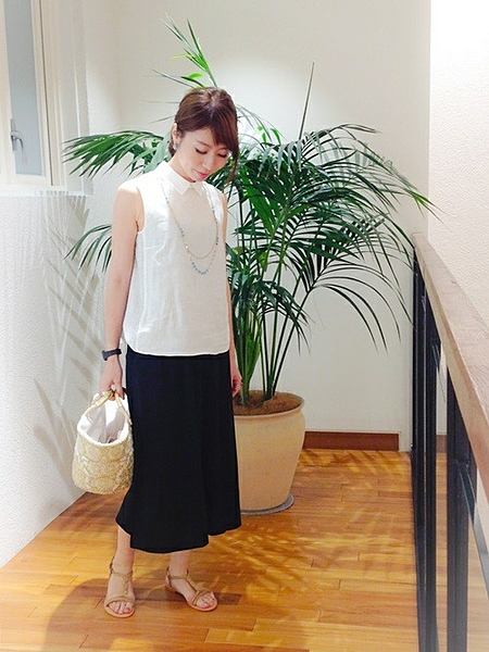 ゴールドのボタンと肩のフラップデザインがクールなノースリーブシャツ。でこぼことした皺のある素材なので、プレーンな白ガウチョやパンツあわせでもかっこよく決まります。