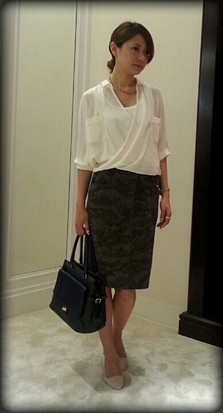 はっきりとした迷彩柄なのに、シフォン素材を使っていることで女性らしさも感じるノーリーブシャツ。白のタイトに合わせれば、クールで知的なオフィススタイルの完成です。
