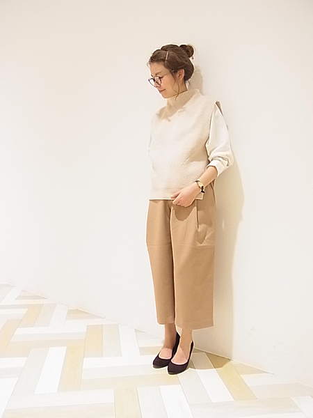 今期流行のガウチョパンツも、ベージュカラーならサファリテイストの着こなしが実現。ウエストサイド部分に、レースアップをくみこんだ、ディテール感あふれる一枚。