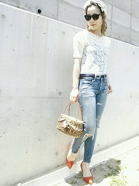 白のレース素材のトップスはダメージジーンズと合わせると甘くなりすぎなくてかわいい♪シンプルになりすぎないように、ガーリー系の小物を合わせるのもポイント♡