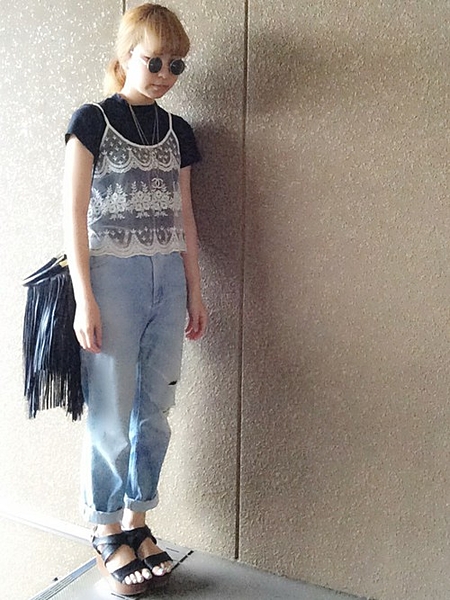 レースキャミに黒トップスをアンダーに着てダメージジーンズを履けば黄金のバランススタイルが出来上がり♡