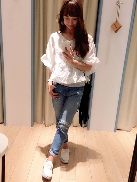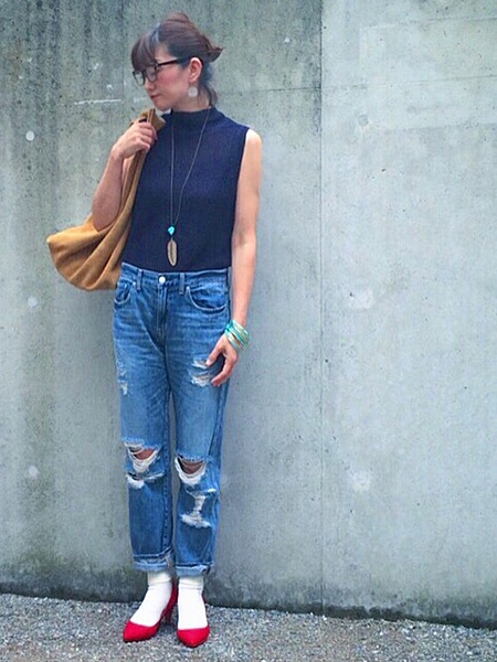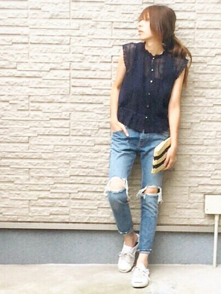 女性らしいフォルムのトップスはダメージジーンズでバランスをとろう♪