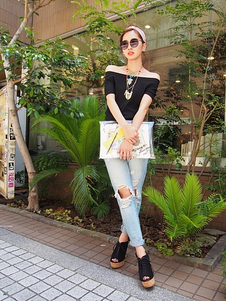 オフショルはスカートと合わせると甘めになりすぎるから、ダメージジーンズと合わせるのがオススメ♪