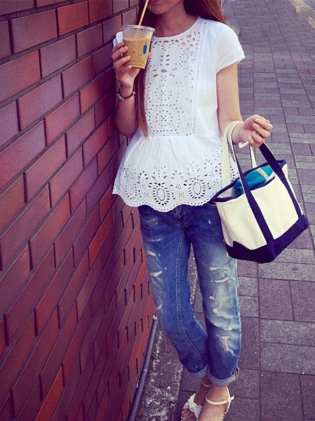 甘めホワイトトップスに合わせるのはダメージジーンズがベスト。