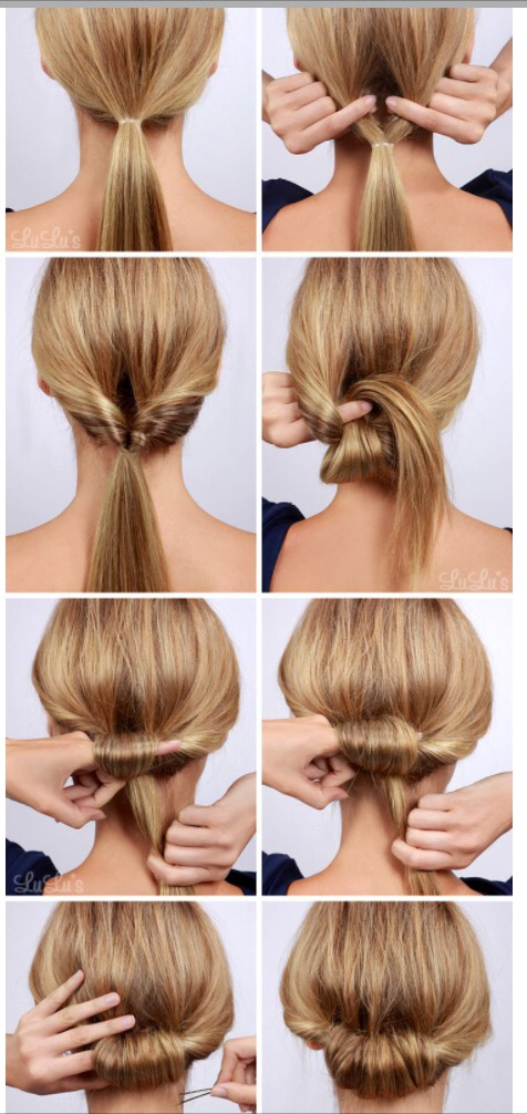 出典:http://weheartit.com 基本のやり方はこちら。 ①好きな高さでひとつに結びます。 ②結び目の上をふたつに割り、くるりんぱ。 ③さらにくるくると結び目に髪を巻き付けるようにまとめ、毛先をしまいこむようにピンで固定し完成。