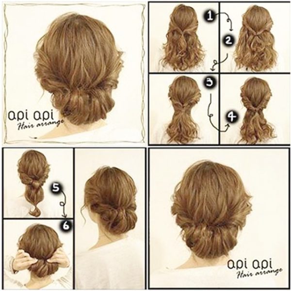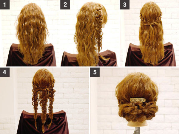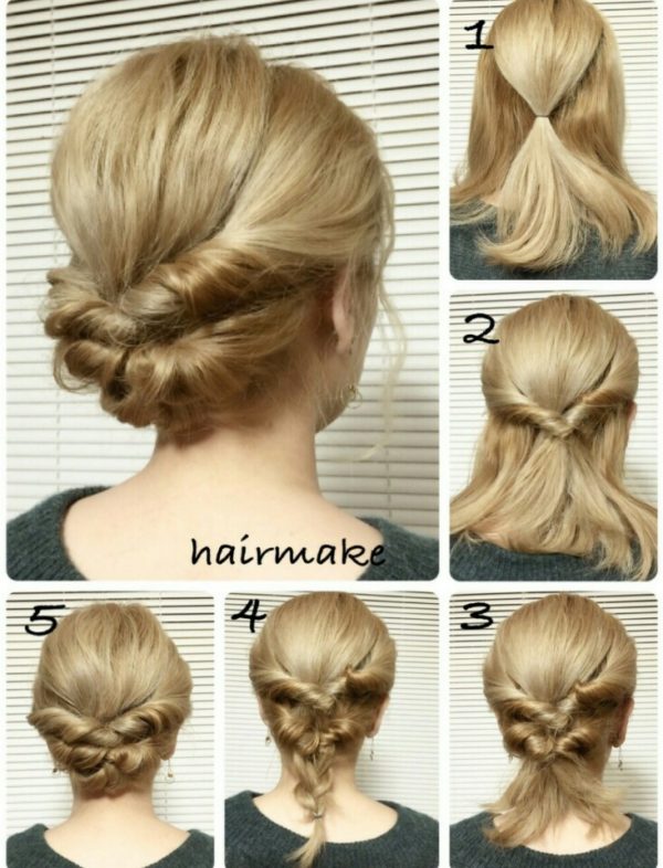 出典:https://s-media-cache-ak0.pinimg.com ①②後頭部にハーフアップの量で髪を取り、くるりんぱ。 ③2のしたでひとつにまとめてくるりぱ。 ④毛先までゆるく三つ編み。 ⑤ギブソンタックの要領でまとめてピンで固定し完成。