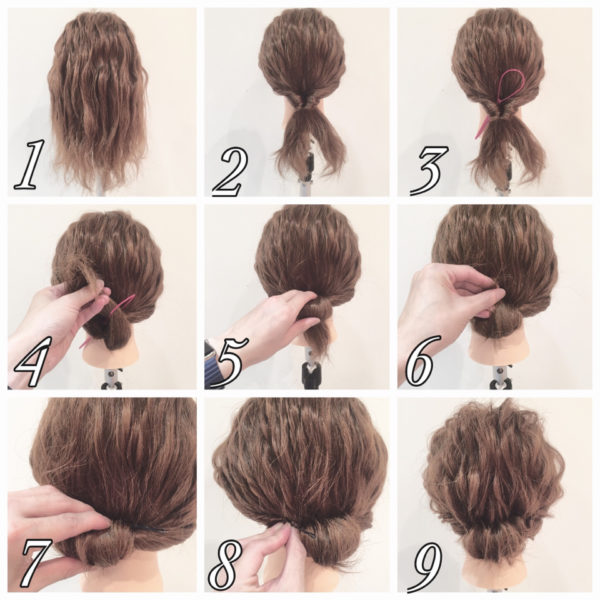 出典:http://matome.naver.jp ①②両サイドから少なめにとった毛束を後頭部でひとつにまとめ、くるりんぱ。 ③④耳下の毛束を②の髪にひっかけるように巻きつけます。 ⑤⑥毛先の方で一度結んでまとめやすくしてから丸め、④にひっかけるようにまとめ、ピンで固定し完成。