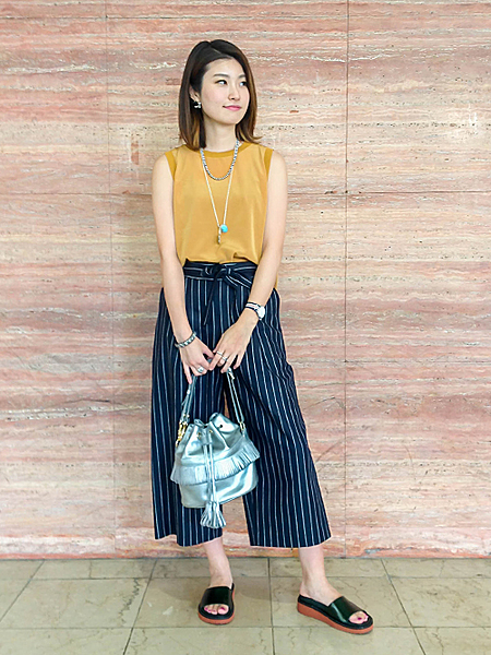 シアーなオーガンジーの切替ラインが、ニュアンスある大人映えする着こなしに。今季トレンドのガウチョパンも、こんなルックスならいっそうモダンに差が付きます。光沢感のある生地使いで、ドレッシーなムードもUP。