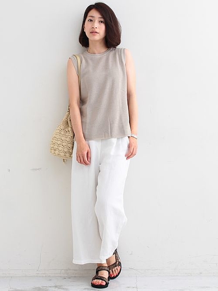 なやかな風合いと、シンプルなデザインで、高感度な大人の着こなしを演出します。ノースリーブなので、羽織りをプラスすればロングシーズン愛用OK。足首見せのクロップド丈はフラットサンダルとの相性も抜群。